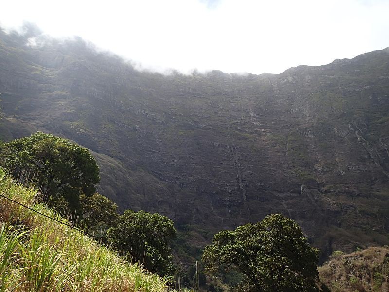 C'est ce côté ouest de l'île qui est moins aride et permet la culture en terrasses avec une bonne gestion de l'irrigation. La descente commence sur les à-pics vertigineux à 1600m d'altitude d'où on verrait presque les Antilles ! Puis plantations de plus en plus verdoyantes : canne à sucre avec distilleries de grog bien sûr, bananes, haricots, avocats, cocotiers, maïs, papaye, arbre à pain, ... etc.