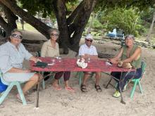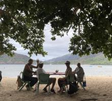 Satisfaits de notre effort du jour et du spectacle de nos bateaux paisiblement ancrés, nous savourions notre boisson, les pieds dans le sable « chez Juliette » à l’ombre de la canopée.