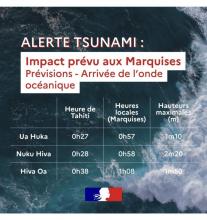 Comme prévu par l’alerte de la NOAA, cette onde de tsunami toucha les îles Marquises en Polynésie française,