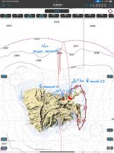 Nous avons tourné en mer assez loin jusqu’au lever du jour, en faisant des AR sous voile d’avant seule: nos trajets de cette nuit là sont ceux du Nord (en haut) sur la carte ci dessous