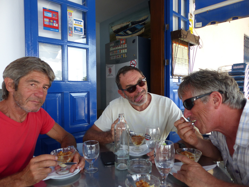 Alain (Kradok I) , Raymond (le cuistot) et Jean (kradok II ), bistrot de l'île de Graciosa, en mode préparation de la traversée de l'atlantique...