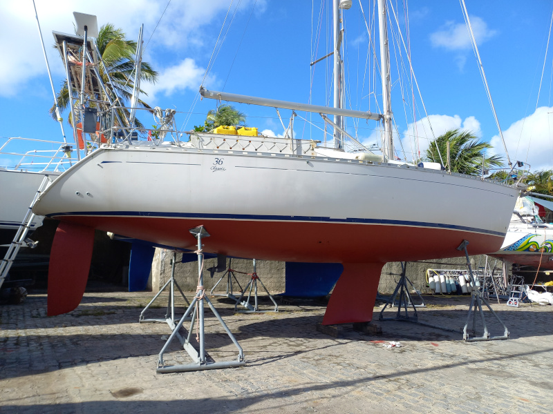Je fais gratter les vieilles couches d’antifouling accumulées au fil des années, avant d’appliquer une primaire et un nouvel antifouling d’un beau rouge brique. Une nouvelle hélice vient compléter la garde-robe sous-marine de Sara.