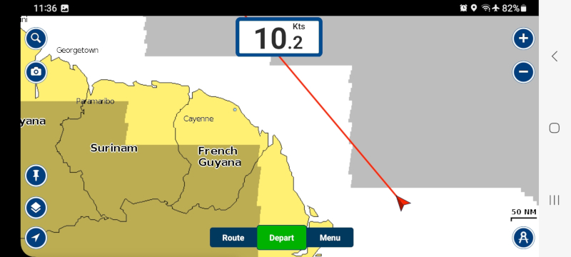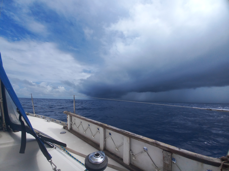 Des moments plus calmes alternent avec des grains soudains qui, souvent la nuit, font grimper le vent de 15 à 30 nœuds en quelques minutes. Nous naviguons très au large, au-delà de l’immense plateau continental qui borde le Brésil, parsemé de bancs de sable et de bateaux de pêche sans AIS.