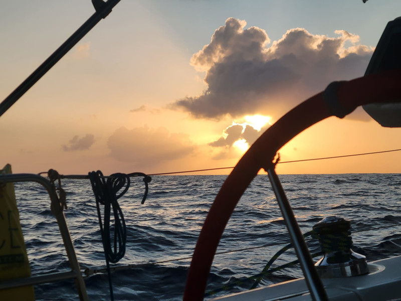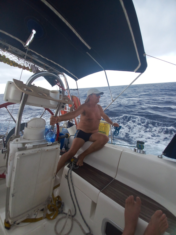 Le vent souffle à 25 nœuds au portant, la mer est agitée, et ça remue bien. Xavier souffre un peu du mal de mer et peine à se reposer. La chaleur à bord n’arrange rien.