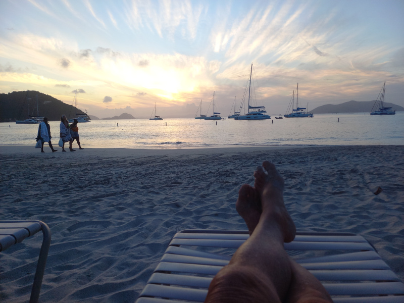 À Soper’s Hole, la baie est pleine de bouées ; je dois mouiller par 20 m de fond un peu à l’extérieur. Ce n’est pas l’idéal.